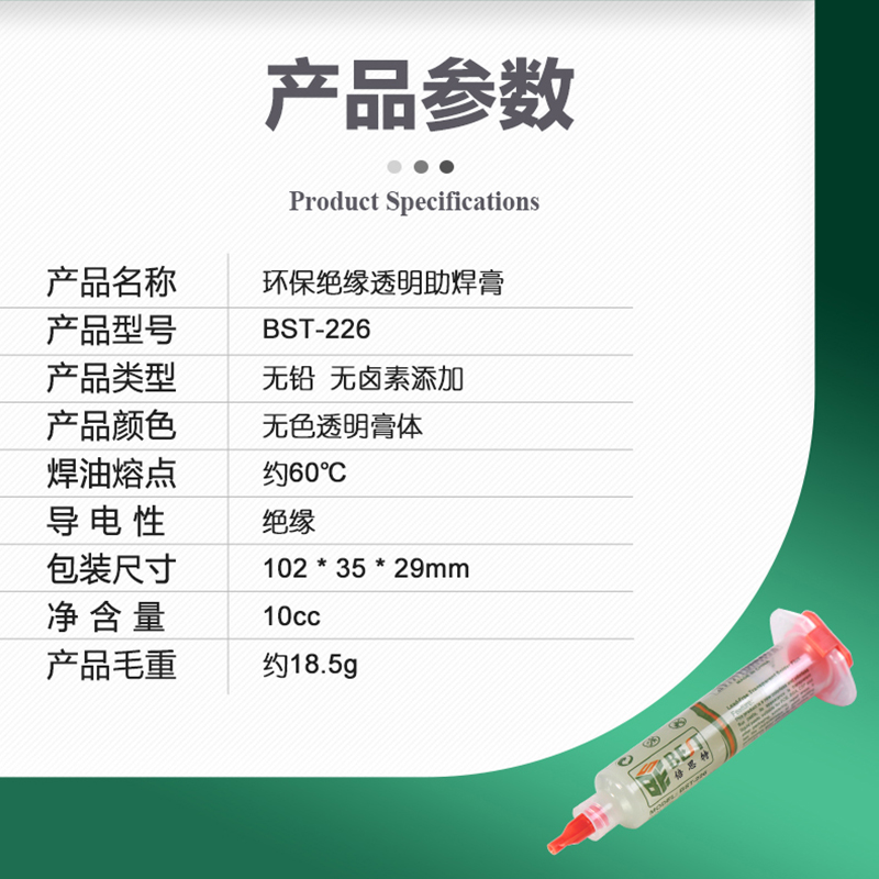 返回當(dāng)前位置: 首頁(yè) / 產(chǎn)品中心 / BST-226 環(huán)保絕緣透明助焊膏 電子元器件焊接助焊膏免清洗手機(jī)維修透明焊油10cc