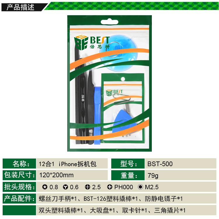 ? 產品名稱: 12合1 iPhone拆機包? 產品型號: BST-500? 產品類別: 拆機工具系列