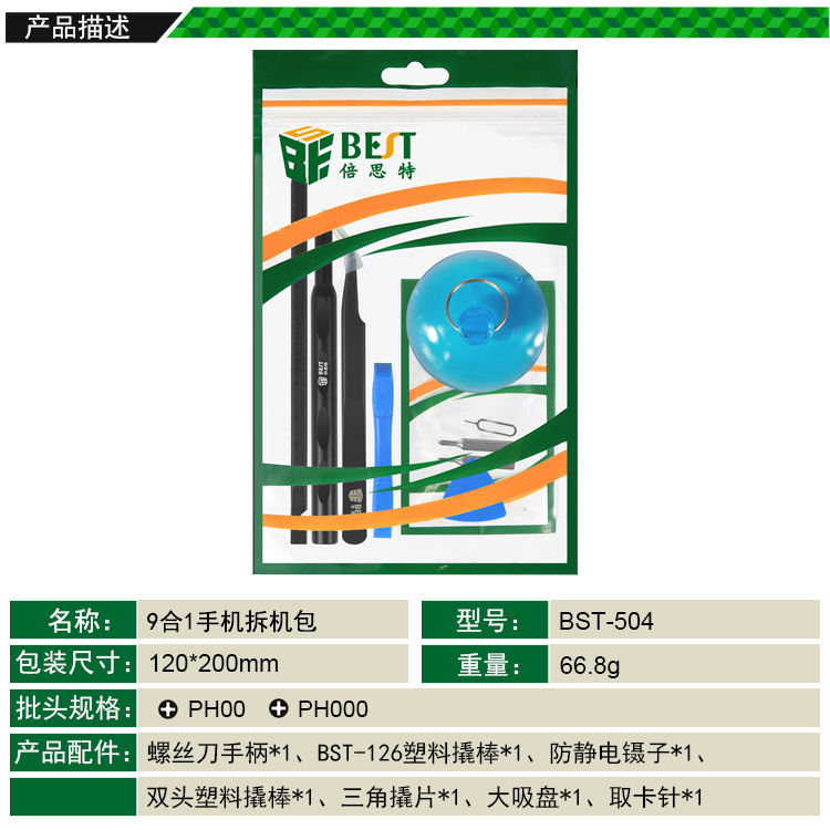 ? 產品名稱: 9合1 三星手機拆機包? 產品型號: BST-504? 產品類別: 拆機工具系列