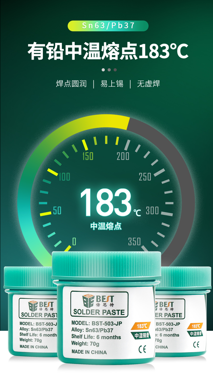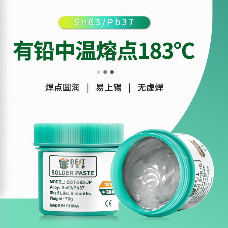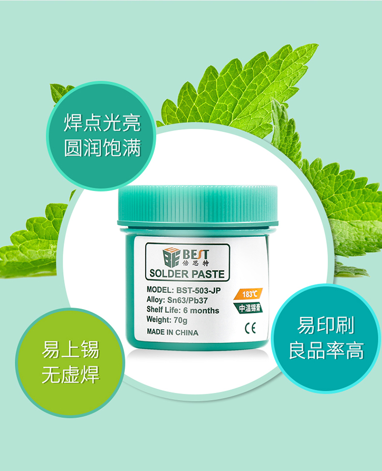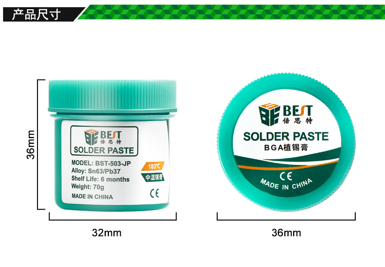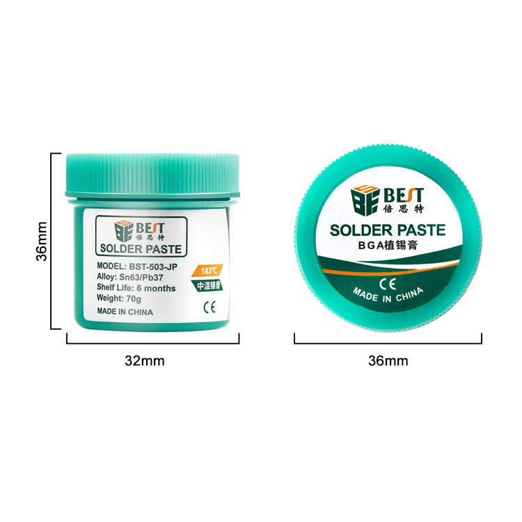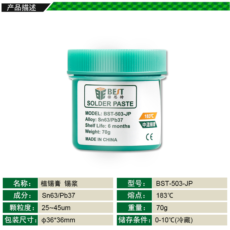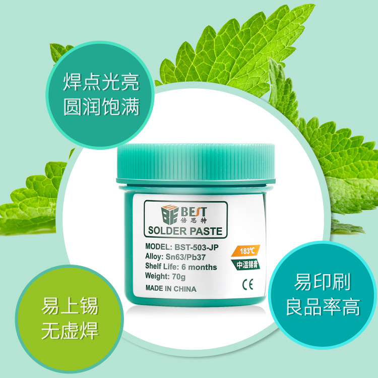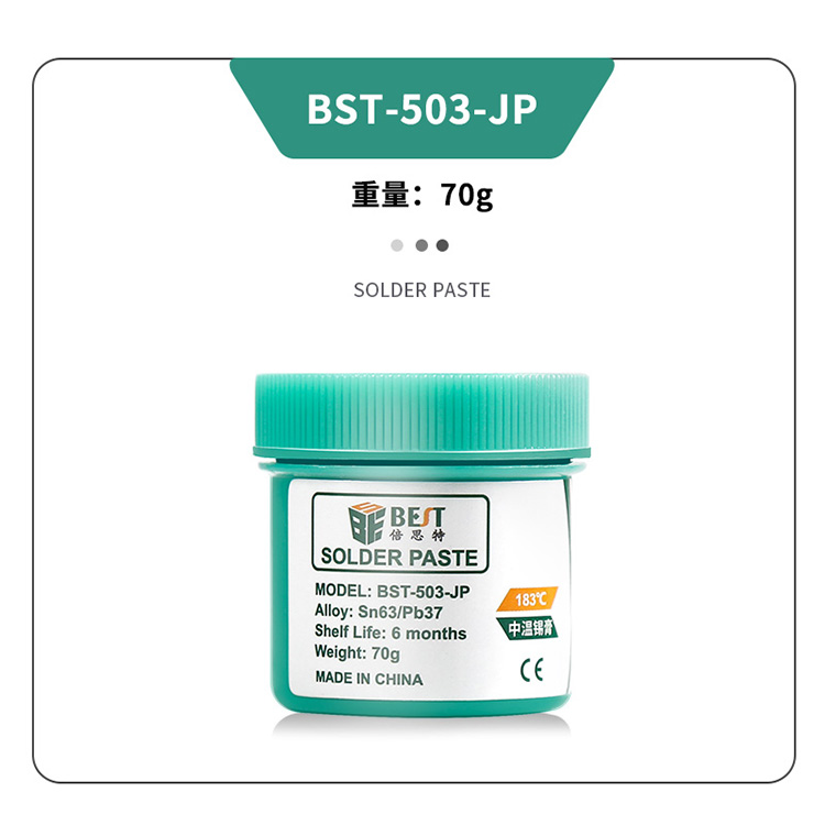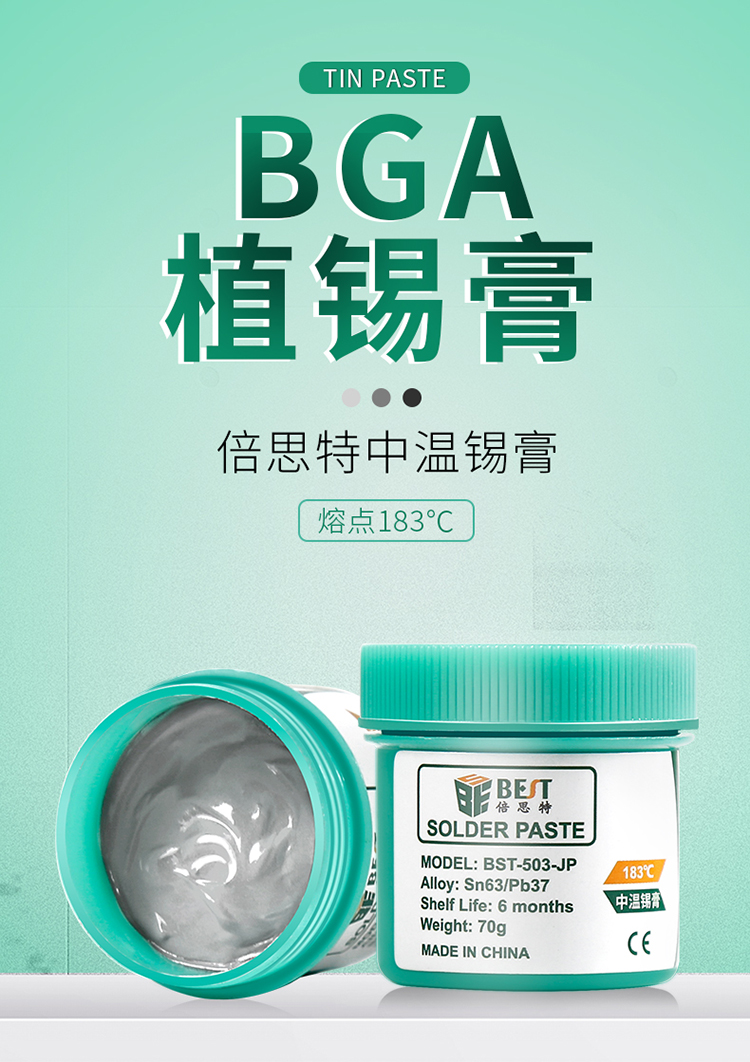 ? 產品名稱: 中溫錫漿 BGA植錫膏? 產品型號: BST-503-JP? 產品類別: 錫漿焊油系列? 產品成分: Sn63/Pb37? 產品重量: 70g
