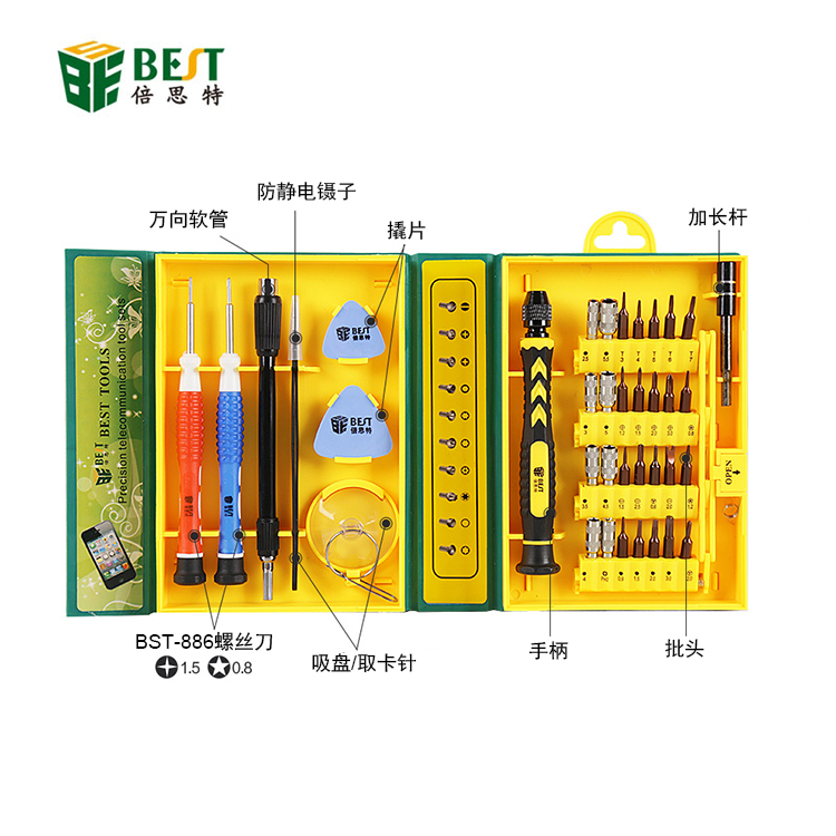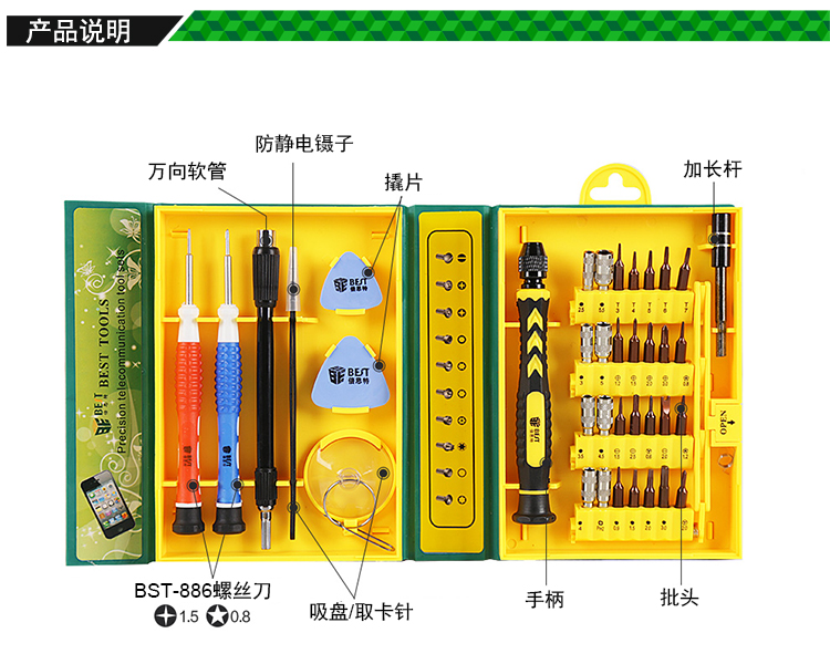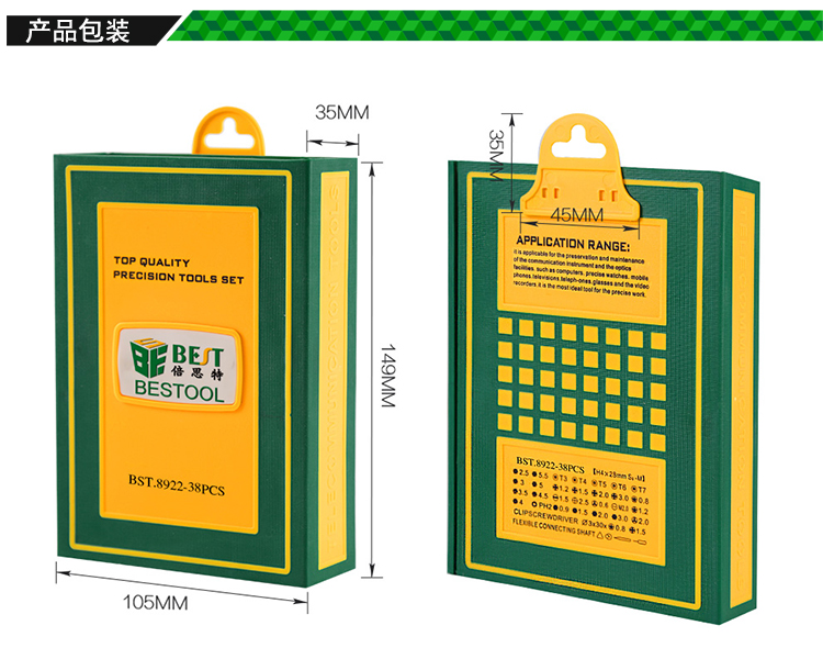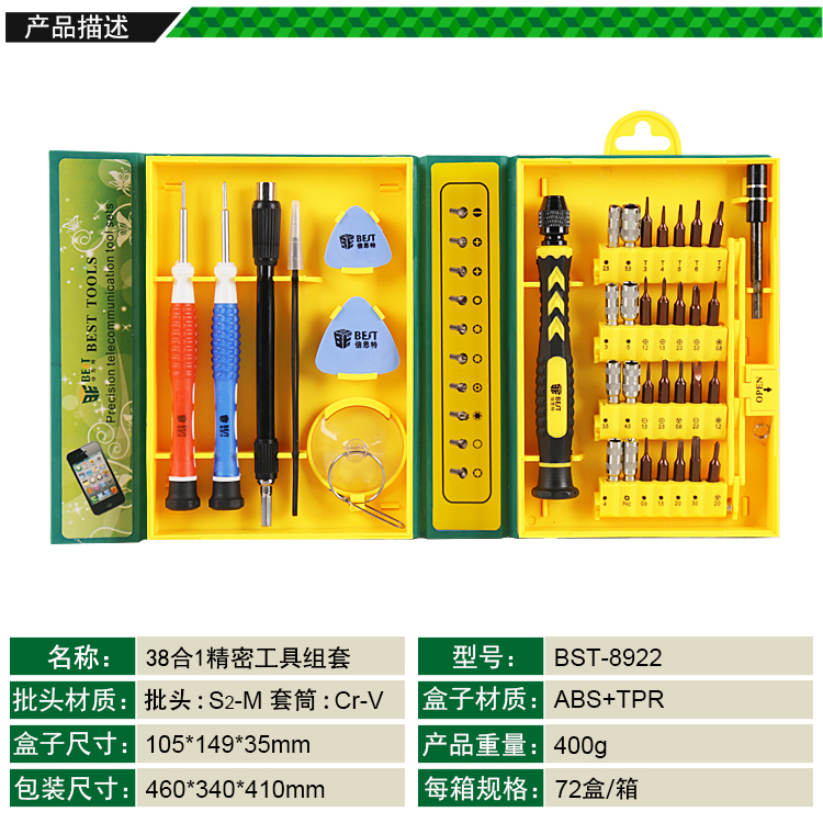 ? 產品名稱: 精密工具組套38pcs 高精密螺絲套批? 產品型號: BST-8922? 產品類別: 螺絲批系列