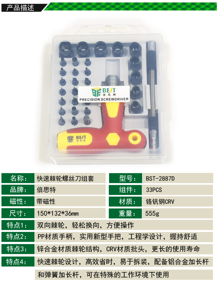 返回當前位置: 首頁 / 產(chǎn)品中心 / BST-2887D 33件套 快速棘輪螺絲刀組套