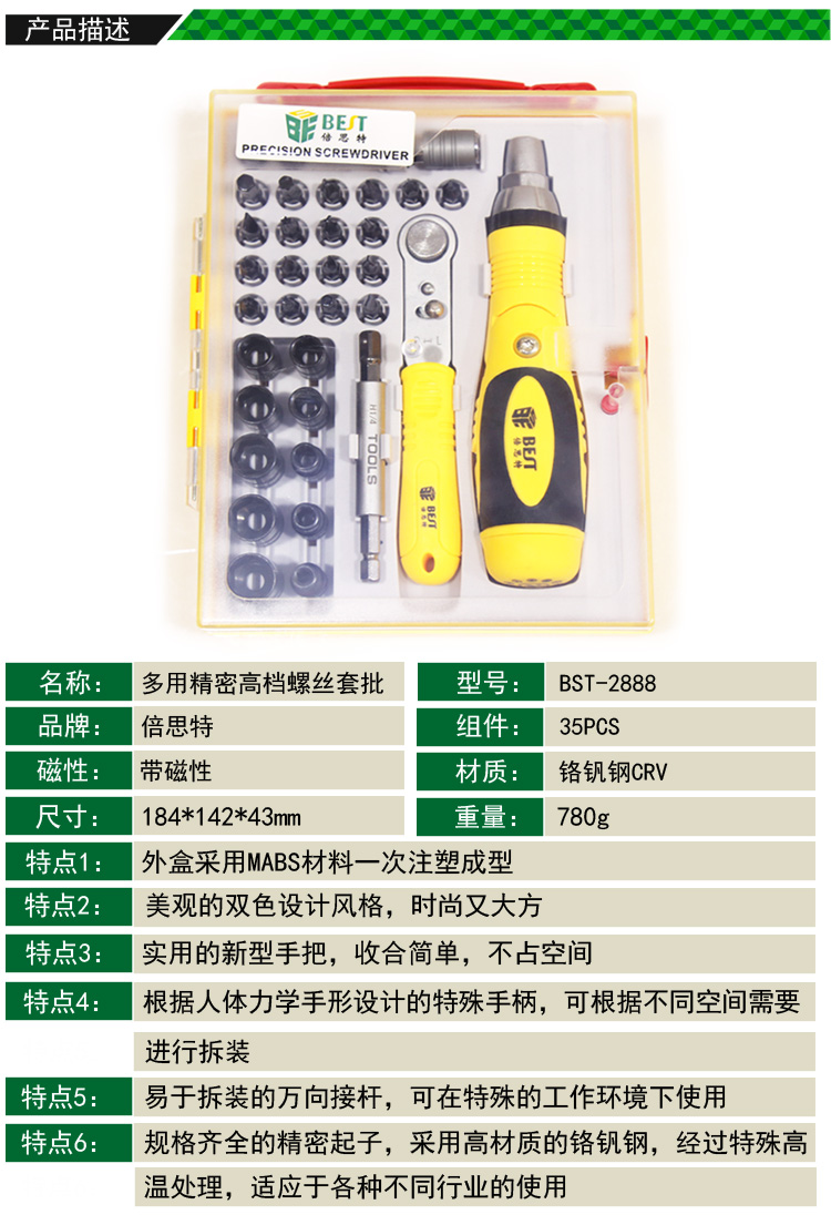 返回當(dāng)前位置: 首頁 / 產(chǎn)品中心 / BST-2888 35件套 多用精密高檔螺絲起子套裝