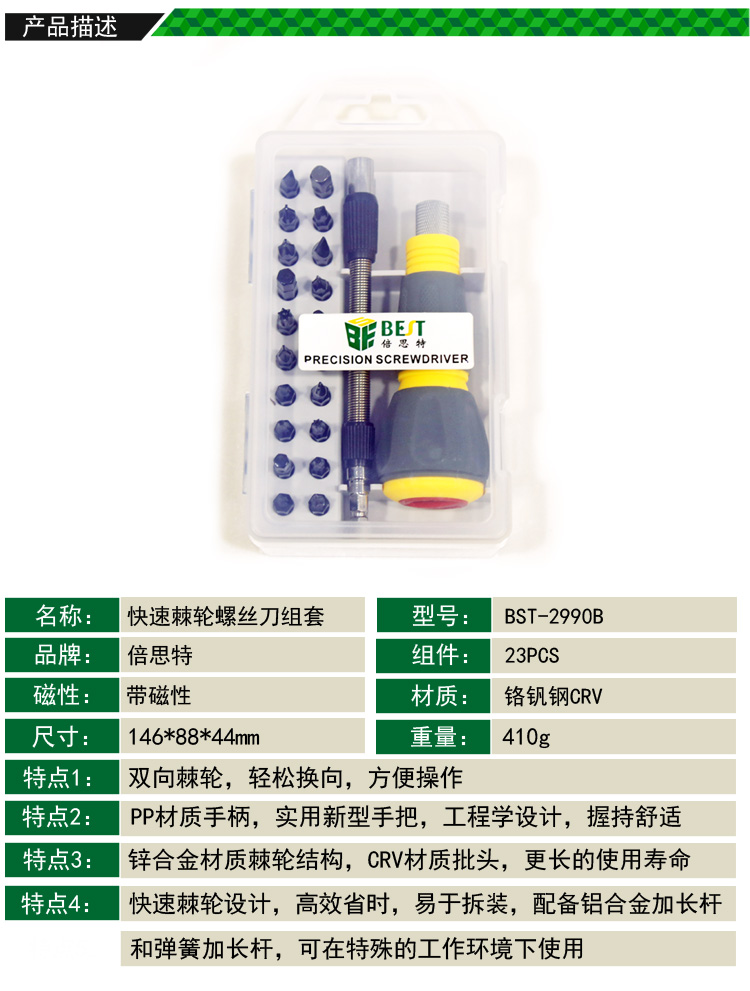 ? 產品名稱: 23件套 快速棘輪螺絲刀組套? 產品型號: BST-2990B? 產品類別: 螺絲批系列