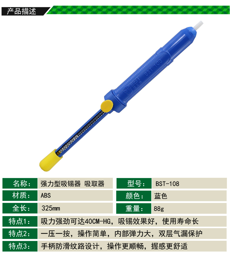 ? 產品名稱: 吸取器 吸錫器? 產品型號: BST-108? 產品類別: 吸錫器系列