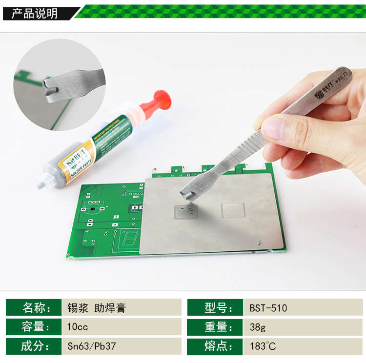 ? 產品名稱: 針筒式錫漿10cc? 產品型號: BST-510? 產品類別: 錫漿焊油系列