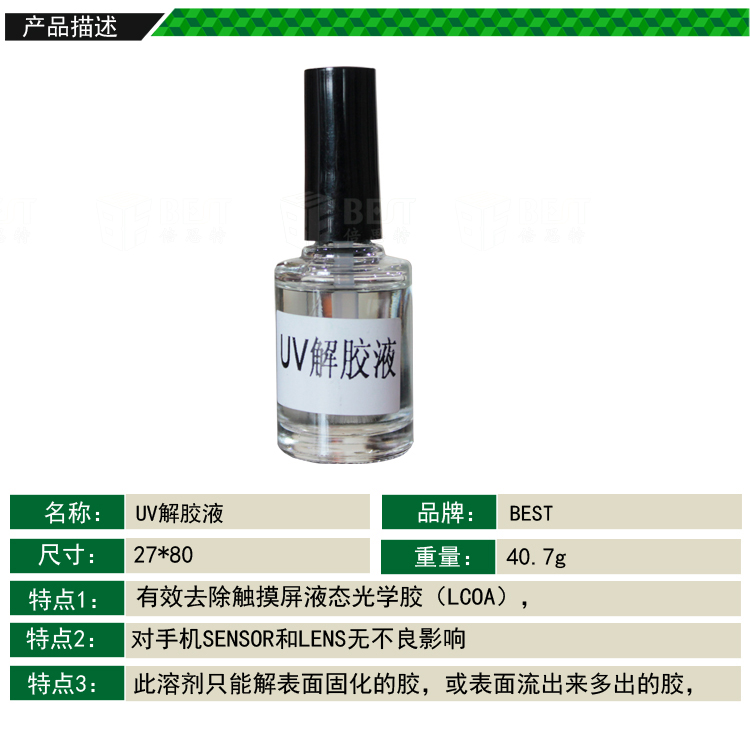 ? 產品名稱: UV解膠液? 產品品牌: BEST? 產品類別: 清潔劑輔料系列