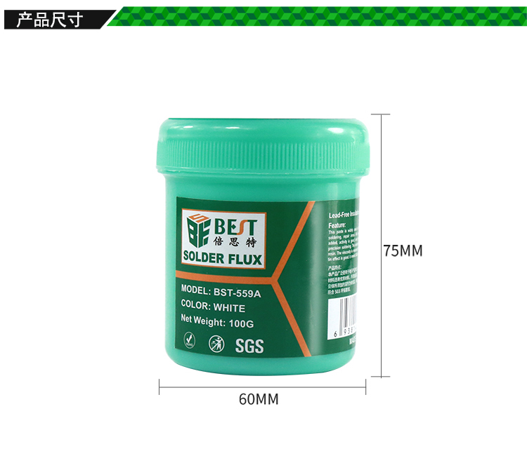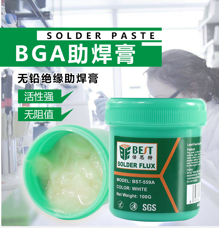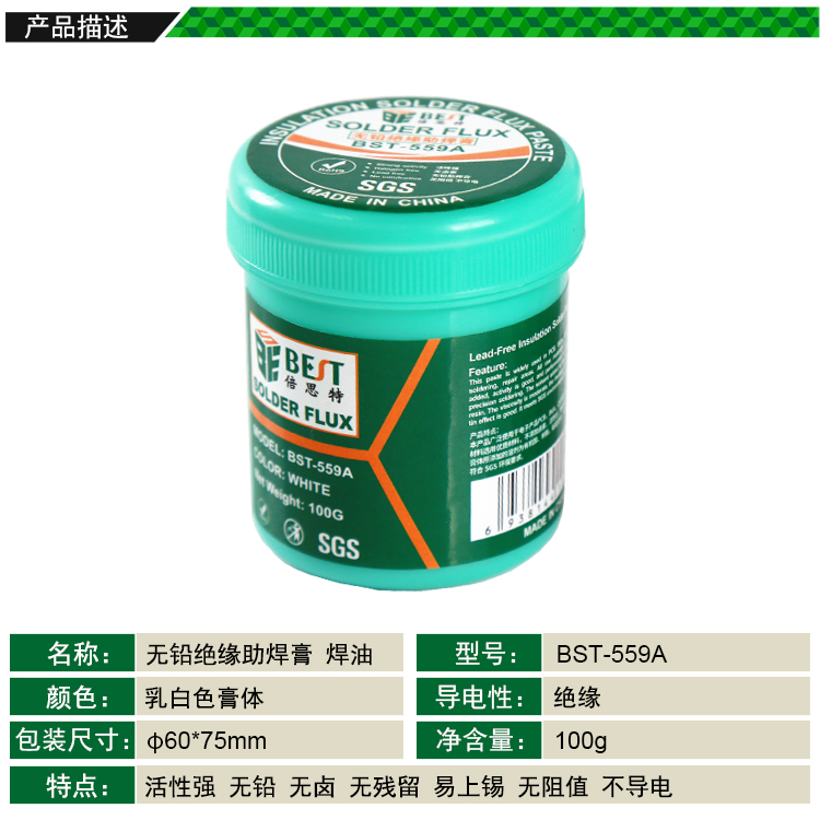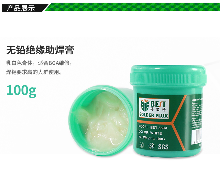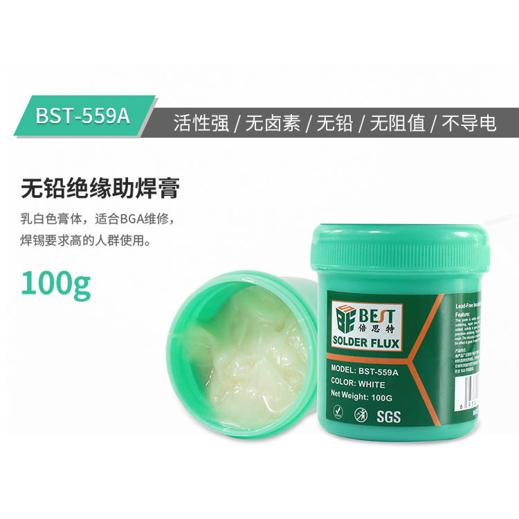 ? 產品名稱: 無鉛絕緣助焊膏? 產品型號: BST-559A? 產品類別: 錫漿焊油系列? 凈含量: 100g
